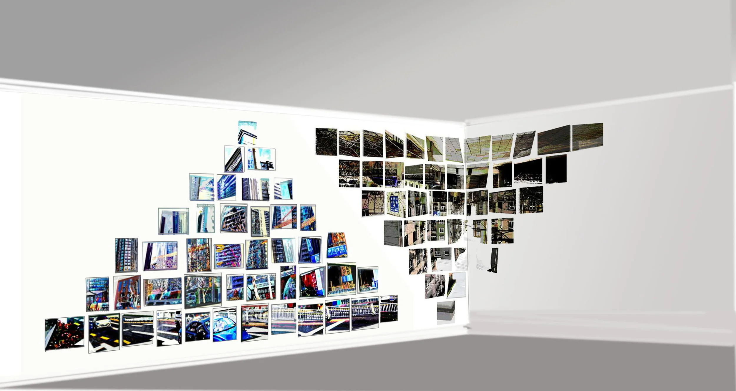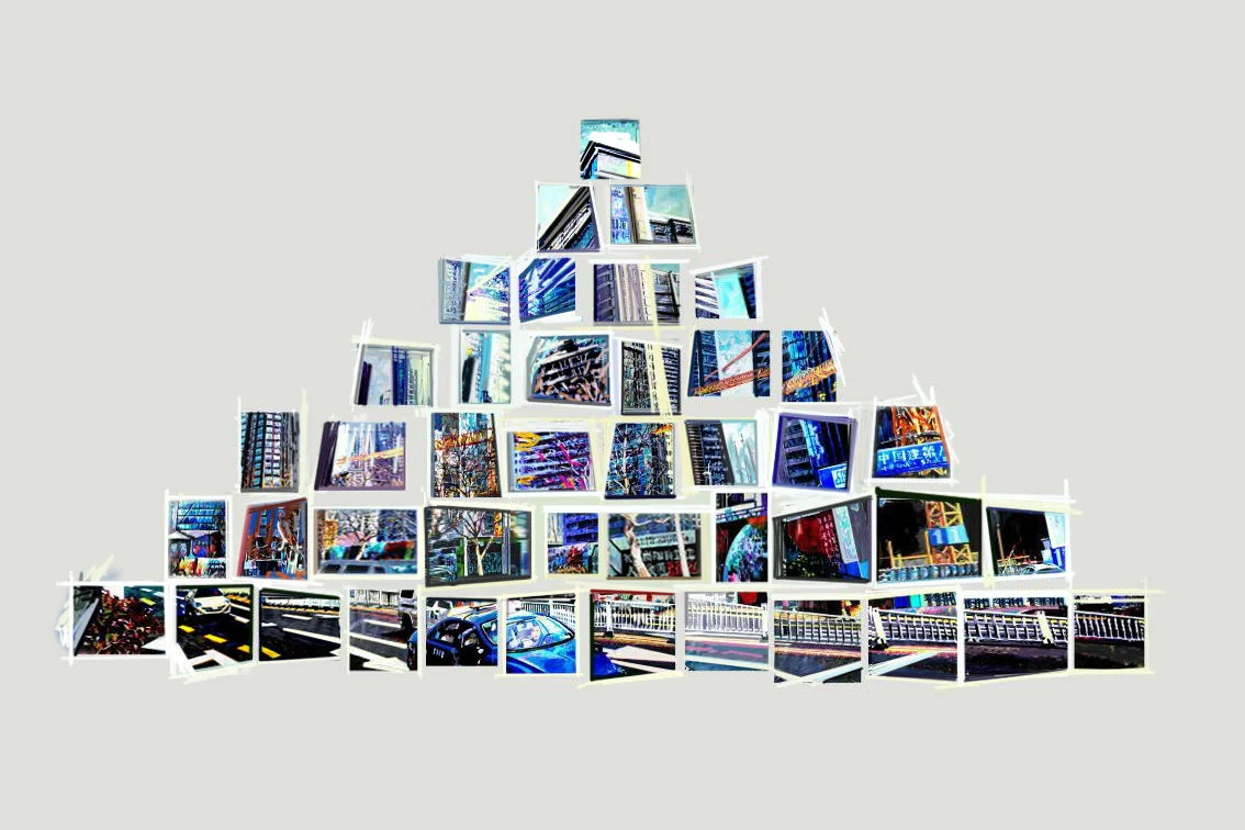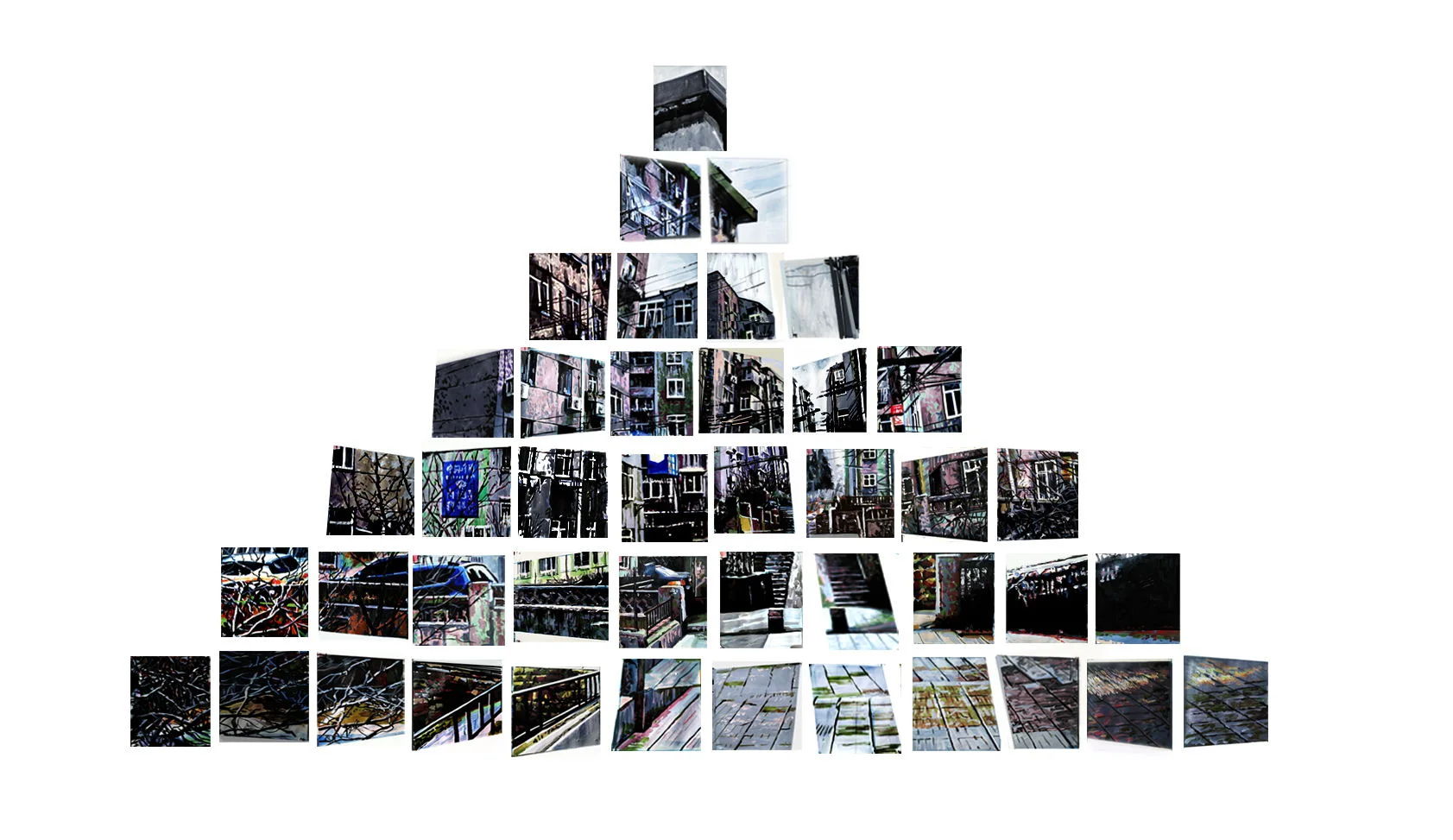 采集青岛城市街景的影像,绘制于方形画面中并进行累叠和堆砌,将画作排列为正三角形与倒三角形,然后展示在墙面之上。通过墙面的转角处理,使堆积的三角形在展示空间中产生进一步的转折变异。